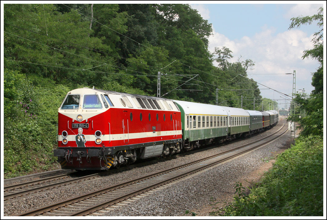 Anläßlich des 50-jährigen Jubiläums des Elektromarktes “Saturn” charterte die Firma verschiedene Sonderzüge um die Mitarbeiter in einer Sternfahrt zu den Feierlichkeiten nach Köln zu bringen. Einer der Züge wurde gezogen von der 119 158... |